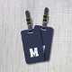 Élégante étiquette de bagage bleu personnalisable avec cadre blanc sur le côté arrière et monogramme gras.