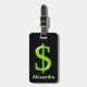 Cette étiquette de bagage comporte un grand symbole dollar jaune et vert ($), avec un nom personnalisé. Les détails de contact sur le dos peuvent être personnalisés, aussi.