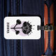 A sleek white luggage tag featuring a modern, stylized black floral design with abstract petals and stems, set against a subtle lavender teardrop background. Below the flower, the name "SANDRA" is printed in bold, artistic lettering, making it a personalized and elegant accessory.