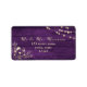 Elégante grange rustique bois violet marque d'adresse de retour pour les invitations de mariage avec dentelle fleurie or et lumières à cordes.