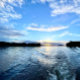 Beau Lac Oconee Coucher de soleil avec ciel bleu, eau bleue, vagues, nuages blancs, soleil jaune, entourage violet