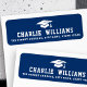 Étiquettes d'adresse de retour de graduation en bleu foncé ou en couleur personnalisée avec une casquette de graduation avec votre nom ci-dessous dans une police de style sportif collégial. Texte en couleur blanc ou personnalisé sur un arrière - plan en couleur bleu foncé ou personnalisé.
