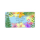 Beau flamant rose en combinaison avec coloré, aquarelle, fleurs tropicales et feuilles de palmiers. Luau, adorable, motif rayé bleu, les étiquettes d'adresse de retour de la fête d'été.