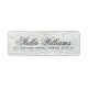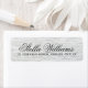 Élégantes étiquettes d'adresse de retour avec votre nom dans une police de script de calligraphie élégante et l'adresse ci-dessous sur un arrière - plan de grain de bois gris clair.