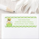 Jolie étiquette d'adresse de retour avec un thème bébé, ce design comprend une petite girafe ayant un bain dans un bain vert plein d'accessoires pour bébé. Un motif à rayures de chevron vert et blanc forme le cadre du étiquette. Modifiez avec votre adresse de retour. L'adorable dessin de la petite girafe avec l'aimable autorisation de Kristi W. Designs.