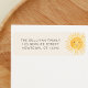 Cette étiquette d'adresse de retour de baby shower sur le thème du soleil présente un joli soleil souriant jaune et une typographie élégante sur un arrière - plan crème. Facile à personnaliser. Aquarelle originale © Michele Davies.