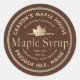 Un étiquette au sirop d'érable de couleur terreuse avec les mots "sirop d'érable" dans une police en or métallique en relief. Bordure à trois lignes en or. Feuille d'érable d'or et texte.