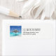 Étiquettes de adresse à l'image tropicale d'une mer turquoise avec une plage de sable blanc et un seul parasol en chaume. La typographie dit Beach Bum.