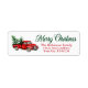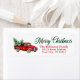 A beautiful holiday return address label featuring modern calligraphy script Merry Christmas with a watercolor vintage red truck, Christmas trees and snow.