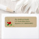 Une étiquette d'adresse de retour de Noël avec un cardinal rouge stylisé assis sur une branche de saint avec des branches de pin et des tourbillons dorés sur la marge gauche sur un parchemin à l'air arrière - plan. Le texte est sous une forme modèle, ce qui permet de le modifier facilement et de le faire vous-même.