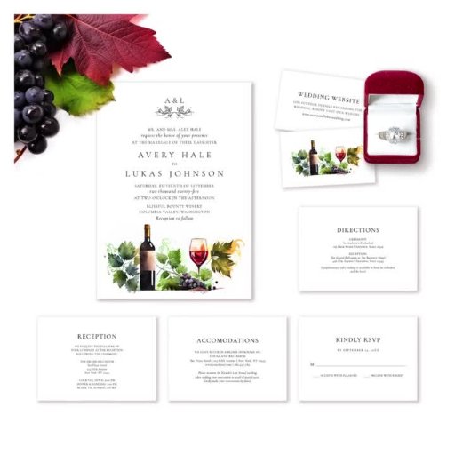 Les éléments design sophistiqués de cette invitation incarnent le charme intemporel d'un mariage classique et élégant. La palette noir et blanc dégage un raffinement sobre, tandis que la disposition minimaliste assure une présentation de bon goût. La crête de vin verdoyante ajoute une touche d'élégance naturelle et de romantisme à cet ensemble chic sans effort.