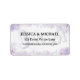 Complétez votre suite de papeterie de mariage avec ces élégantes "Étiquettes d'adresse de retour" qui présentent un délicat design floral aquarelle lavande et violet. Inspirée par une esthétique de jardin romantique, la mise en page met en valeur les noms "JESSICA & MICHAEL" dans une police sérif or ton sophistiqué, complétant parfaitement les bordures florales douces.
