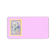 Precious Coton de Tulear express ses remerciements sincères reposant sa patte sur un cadeau sur un arrière - plan de conception jaune et violette. Illustration au crayon de Prismacolor par Laura J. Holman © 2010.