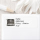 Photographie de la machine à écrire manuelle avec l'adresse imprimée en police de caractères classique.