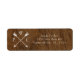 Ce étiquette présente une texture d'écorce d'arbre dans l'arrière - plan pour une atmosphère rustique et chaleureuse. Il y a deux flèches croisées à gauche avec un coeur et les initiales de la mariée et du marié. Cette étiquette est à la fois élégante et tendance et est idéale pour un mariage à thème nature ou extérieur.