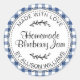 Étiquette ronde de confiture maison gingham bleu myrtille avec écriture manuscrite noire et accents botaniques simples sur fond blanc. Le format rond classique et le doux carreau bleu créent une impression chaleureuse et rustique qui se marie parfaitement avec les pots, les pâtisseries et les cadeaux faits maison. Personnalisez facilement avec vos détails.