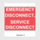 Un autocollant DISCONNECT D'URGENCE, SERVICE DISCONNECT étiquette pour électriciens à utiliser pour satisfaire aux exigences de l'article 230.85(E)(1) et (2) du Code national de l'électricité de 2023.