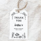 Étiquette-cadeau de mariage fantaisie à la main en noir modifiable avec deux rubans, de la nourriture et des boissons. Cette étiquette de faveur de mariage fantaisie comporte également des polices de caractères manuscrits.