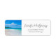 Étiquettes de adresse avec une photo d'un magnifique lieu de vacances. Ciel bleu vif, plage de sable doux avec eaux cristallines cristallines bleu tropical. Une montagne couverte d'arbres luxuriants dans l'arrière - plan. Photographie pittoresque et tranquille.