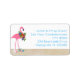 Flamant rose, étiquette d'adresse de retour de taille moyenne, pour la saison des fêtes, ou n'importe quelle période de l'année. Blanc avec texte imprimé bleu tropical, peut accueillir une longue adresse nécessitant quatre ou cinq lignes. Le grand oiseau flamand rose porte une couronne de fleurs d'hibiscus et de branches saintes, et se dresse au milieu de l'étoile de mer et d'un dollar de sable.
