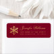 Une étiquette d'adresse de retour bordeaux et or élégante, recommandée pour la carte de vœux des fêtes d'hiver. Elle comporte un flocon de neige en feuille de faux or à gauche et un texte doré à droite. Le nom est écrit dans une calligraphie élégante, l'adresse en petites capitales. Elle peut être utilisée pour une carte de Noël ou de Nouvel An. Le fond est bordeaux (rouge profond).