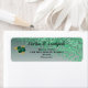Une étiquette élégante avec paillettes vertes, feuilles dorées et roses vertes.