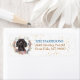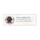 Le côté gauche de ces étiquettes d'adresse de retour présente l'image d'une couronne de fleurs de printemps aux couleurs rose, bleu, or, vert et crème. Au centre se trouve l'image d'un chien de caniche gris. De minuscules confettis d'or donnent un éclat subtil à l'arrière - plan. Votre texte personnalisé est en or bleu et brun à droite.