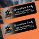 Bienvenue aux invités à votre soirée costumée d'Halloween, baby shower d'Halloween, ou toute célébration éffrayante avec cette étiquette d'adresse de retour simple et amusante avec une couleur sombre, moody, arrière - plan affligé et des polices blanches. Le design comprend une maison hantée noire avec des ppops d'orange de citrouille et des lanternes jack-o', ainsi que des petits fantômes et des chauves-souris ludiques pour compléter l'ambiance festive d'Halloween. Éffrayant Black and Orange Haunted House Halloween Adresse de retour Label avec chauves-souris, fantômes, et un look Moody Vintage.