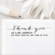 Étiquettes d'adresse de retour de Mariage en Merci noir et blanc, Script simple. Design par Elke Clarke© Disponible à l'adresse www.zazzle.com/monogramgallery. Envoyez vos cartes de remerciement de mariage à vos amis et votre famille en utilisant ce étiquette simple et magnifique avec les mots "merci" écrits dans une police de caractères manuscrite noire. Vous pouvez personnaliser avec vos noms et adresse postale. Autres couleurs disponibles.