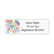 Ces étiquettes d'adresse de retour ont une conception de rectangles qui sont étirés sur une extrémité dans des tons super d'orange, vert, turquoise, violet, bleu, rose et jaune avec des lignes atomiques qui les sillonnent.