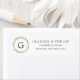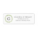 Étiquettes rustiques d'adresse de retour avec votre monogramme à l'intérieur d'une couronne verte de feuille d'olivier à gauche de votre nom et adresse dans une police gris moyen, sur un arrière - plan blanc. Ce design est parfait pour un mariage d'été.
