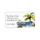 Un palmier à aquarelle tropicale se penche sur l'eau sur ce changement de étiquette de adresse sur le thème sud/Floride. La scène comprend également un quai en bois, typique des maisons sur les voies navigables intracoastales. Le texte est personnalisable pour votre salutation personnelle et vos coordonnées.