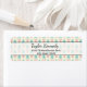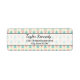 Address labels with a cute christmas pattern with a cream colored background with illustrations of a pastel greenish blue colored christmas tree and a pastel pink bauble with a ribbon in a repeating .