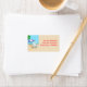 2"l x 3.75"w tan étiquette de adresse pour accompagner notre invitation "Tropical Beach" avec une image d'une scène de plage avec un parapluie, une chaise, des frondes de palmiers et un voilier sur l'océan. Voir invitation et étiquette cadeau correspondant. Voir l'ensemble de la collection Shipwreck Sticker dans les INVITATIONS | Section Stickers & Étiquettes.