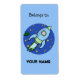 Illustration d'une mignonne fusée dans l'espace, entourée d'étoiles et d'un petit vaisseau spatial vert. Correspond également à :