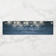 Boissons de mariage élégantes étiquettes personnalisés avec des noms de style signature et votre date de mariage spécial sur un arrière - plan rustique en bois bleu et des lampes à cordes.