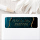 Cette élégante étiquette d'adresse de retour de faire-part de mariage moderne dispose d'un arrière - plan d'aquarelle bleu turquoise orné d'une parties scintillant en faux or. Le texte personnalisable combine un script d'écriture manuscrite de couleur or et des polices de cuivre.