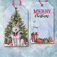 D'un côté de cette étiquette cadeau de Noël se trouve l'aquarelle d'un beau chien sibérien Husky devant un arbre de Noël décoré. Le chien porte un arc rouge vif. Le dos de la balise a une image de paquets cadeaux emballés de couleurs vives, et votre propre texte personnalisé.