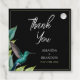 Un agencement mariage saisissant avec un colibri émeraude vivant perché parmi des feuilles tropicaux luxuriants, le tout face à un arrière - plan noir dramatique avec un texte vert et blanc élégant. Parfait pour des fêtes exotiques, de destination ou de plein air.