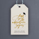 Et donc l'aventure commence ! Un tag cadeau de célébration moderne avec un design élégant de calligraphie de script, un casquette de grad en plein essor et votre message texte personnalisé de félicitations au diplômé ci-dessous. C'est la version couleur or avec un dos noir.