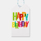 Une étiquette d'anniversaire vibrante avec les mots "Joyeux anniversaire" en caractères gras et colorés. Chaque lettre présente une teinte lumineuse différente, créant une atmosphère festive et joyeuse. La balise est conçue avec un arrière - plan blanc propre.