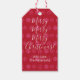 Dites "Joyeux Joyeux Joyeux Noël" en Script blanc avec do-it-yourself Nom sur arrière - plan rouge avec ornements de Noël en rose. Le dos de la balise est le même design avec fuchsia et turquoise sur gris.
