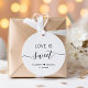 Chic mariage favoritisme étiquettes avec "l'amour est doux" en lettres simples et un script élégant avec des swashes, vos prénoms unis par un coeur et votre date mariage.