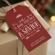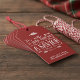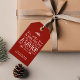 Christian Christmas Verse Typographie Gite Tags avec Luke 2:11 en typographie festive sur un arrière - plan rouge rustique, avec des fleuris pittoresques de branches de pin blanc et de cônes de pin.