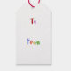 Balise cadeau "Joyeux anniversaire". Texte de couleur arc-en-ciel et ballon rouge vif apporte un peu de plaisir à cette étiquette cadeau. "Joyeux Anniversaire" est sur le devant de la balise cadeau et "À" et "De" est sur le dos de la balise cadeau dans le même style de texte coloré.