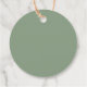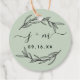 Marque de faveur verte rustique avec feuilles de laurier, initiales de script et date moderne.