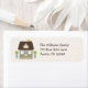 Cette jolie maison avec porte verte, dortoir, cheminée jaune et fenêtre en forme de coeur flanquée d'un topiaire vert fleuri en pots bleus peut être personnalisée avec votre initiale ou monogramme. Cette étiquette d'adresse de retour personnalisée avec un arrière - plan de pois crème peut être customisée avec votre nom et adresse. Oeuvre © Chrissy H. Studios, LLC. Tous droits réservés.