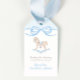 Cette conception d'étiquette de faveur de baby shower vintage charmant présente un cheval à bascule intemporel avec des accents bleus et un nœud bleu élégant avec un cadre en ruban. Ces éléments ont été peints à la main par moi à l'aquarelle avant d'être numérisés. Le verso des étiquettes est un motif de points bleu clair simple.