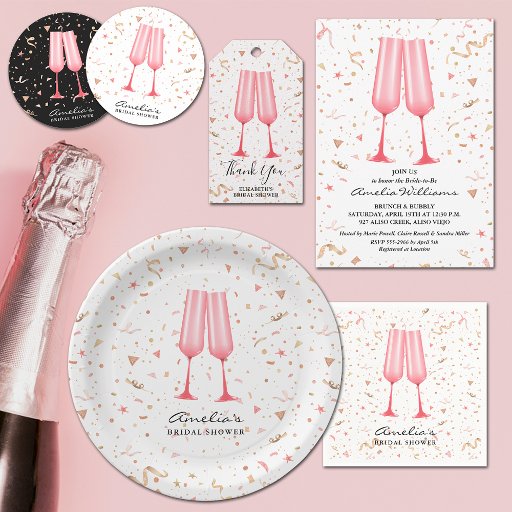 Deux flûtes en verre rose avec confettis rose et or, ces étiquettes de bouteille de vin pétillant sont parfaites pour un thème brunch et bulles pour un shower de mariage. Articles CORRESPONDANTS dans notre collection.