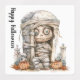 Trouble de la tombe - Mummy Mischief & Mini Monsters Étiquette Une momie aux yeux larges avec un visage squelettique se trouve à l'intérieur d'un tombeau en pierre, une main pointant vers l'extérieur en défiance ludique. Flanquée de deux lanternes jack-o’ sculptées et de minuscules compagnons de squelette, la scène est encadrée de pierres tombales et de feuilles d’automne éparpillées. Le design allie charme éffrayant et méfait caricatural, capte l'esprit d'Halloween à travers un caractère audacieux, des détails étranges et un clin d'oeil de l'inattendu.